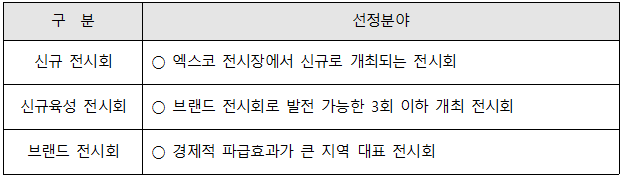 ※ 연초 전시장 비수기 전시회 개최 활성화를 위해 일정상 불가피한 경우 당해년도에 개최된 전시회도 심사를 통해 사후 지원 가능