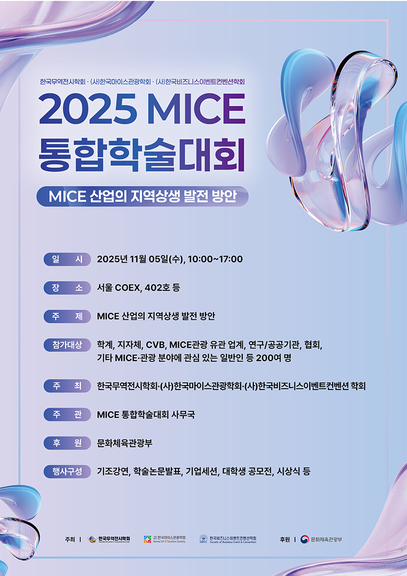 오는 2025년 11월 5일(수), 서울 코엑스에서 한국무역전시학회·(사)한국마이스관광학회·(사)한국비즈니스이벤트컨벤션학회 공동으로 주최하는「2025 MICE 통합학술대회」가 개최됩니다.