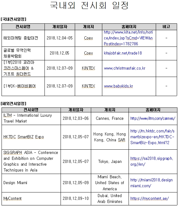 제목 | [안내](진흥회) 2018년 12월 1주 전시회 일정 안내 |