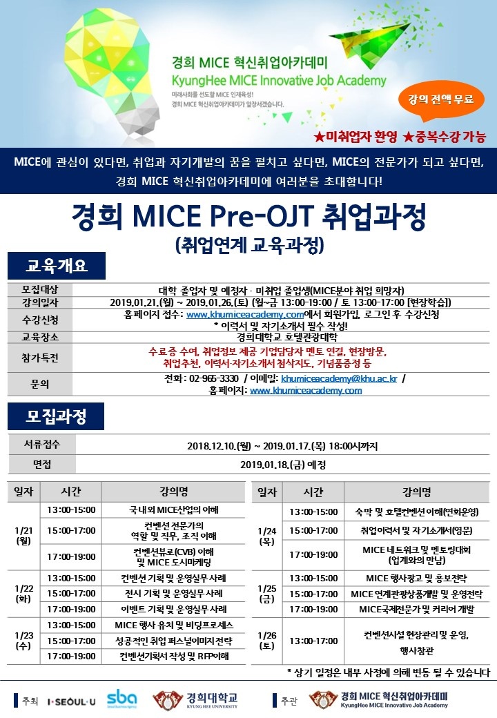 - 이전글[안내](경희대학교) 혁신 MICE 기획과정(재직자 + 취업희망자 통합과정) 19.01.02
