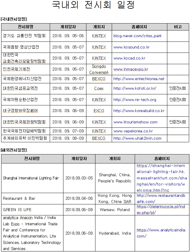 [안내](진흥회) 2018년 9월 1주 전시회 일정 안내