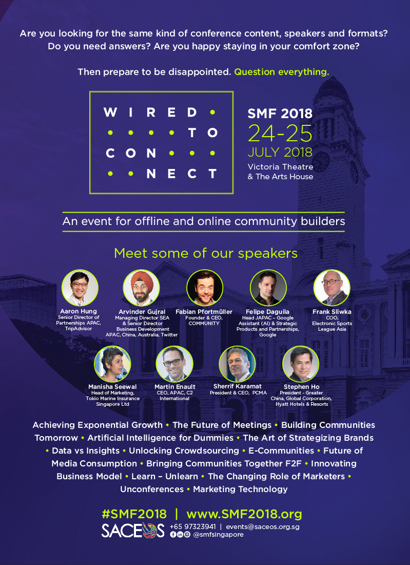 싱가포르전시컨벤션협회(SACEOS)에서 매년 개최하는 싱가포르마이스포럼(SMF 2018)이 2018년 7월 24일부터 25일까지 싱가포르 Victoria Theatre&The Arts House에서 개최됩니다.