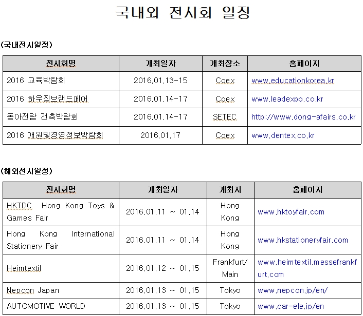 제목 | [안내](진흥회) 2016년 1월 2주 전시회 일정 안내 |